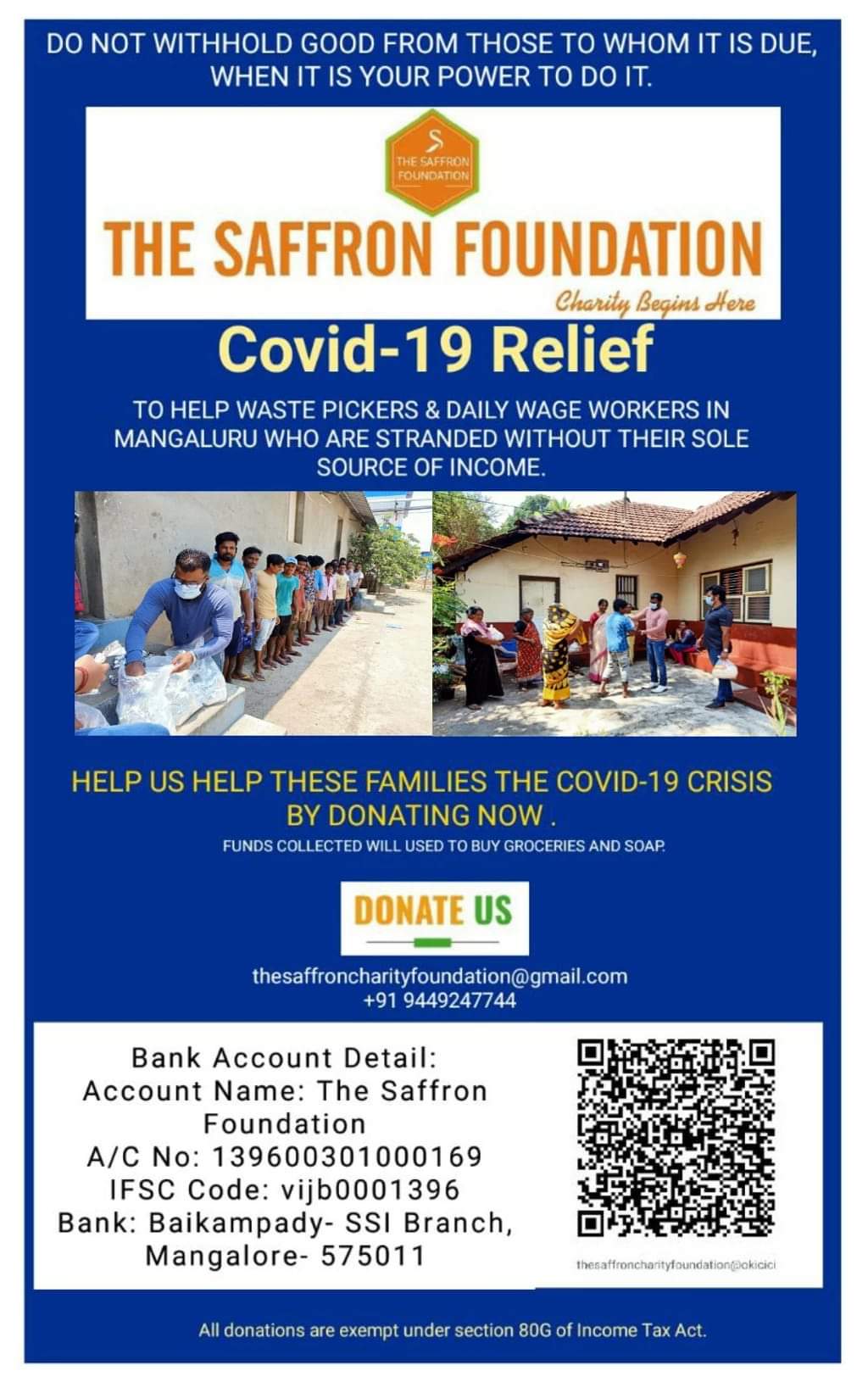 At a time when the entire country is engaged in its fight against COVID-19, the The Saffron Foundation as part of its social responsibility, has decided to contribute its mite in helping the destitute and working class by providing them a square meal every day till the end of the lockdown period. Every day more than 130 people are fed in Surathkal and Bykampady industrial area by Rajesh Pavithran and team,